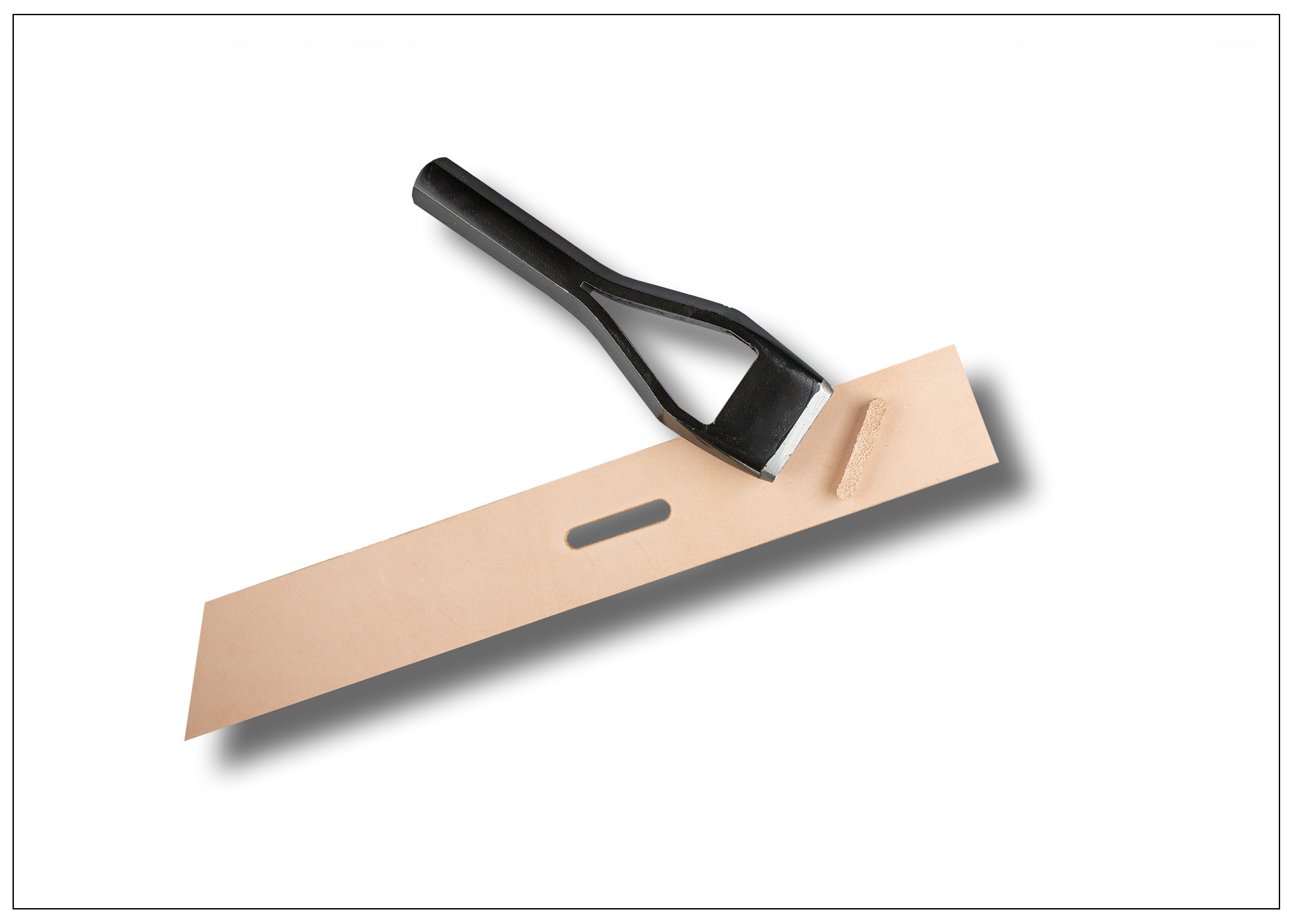 Das Langloch für den Gürteldorn entsteht mit Hilfe eines Kappenlocheisen - die Größe des Langlochs variiert in Abhängigkeit von der verwendeten Gürtelschließe.