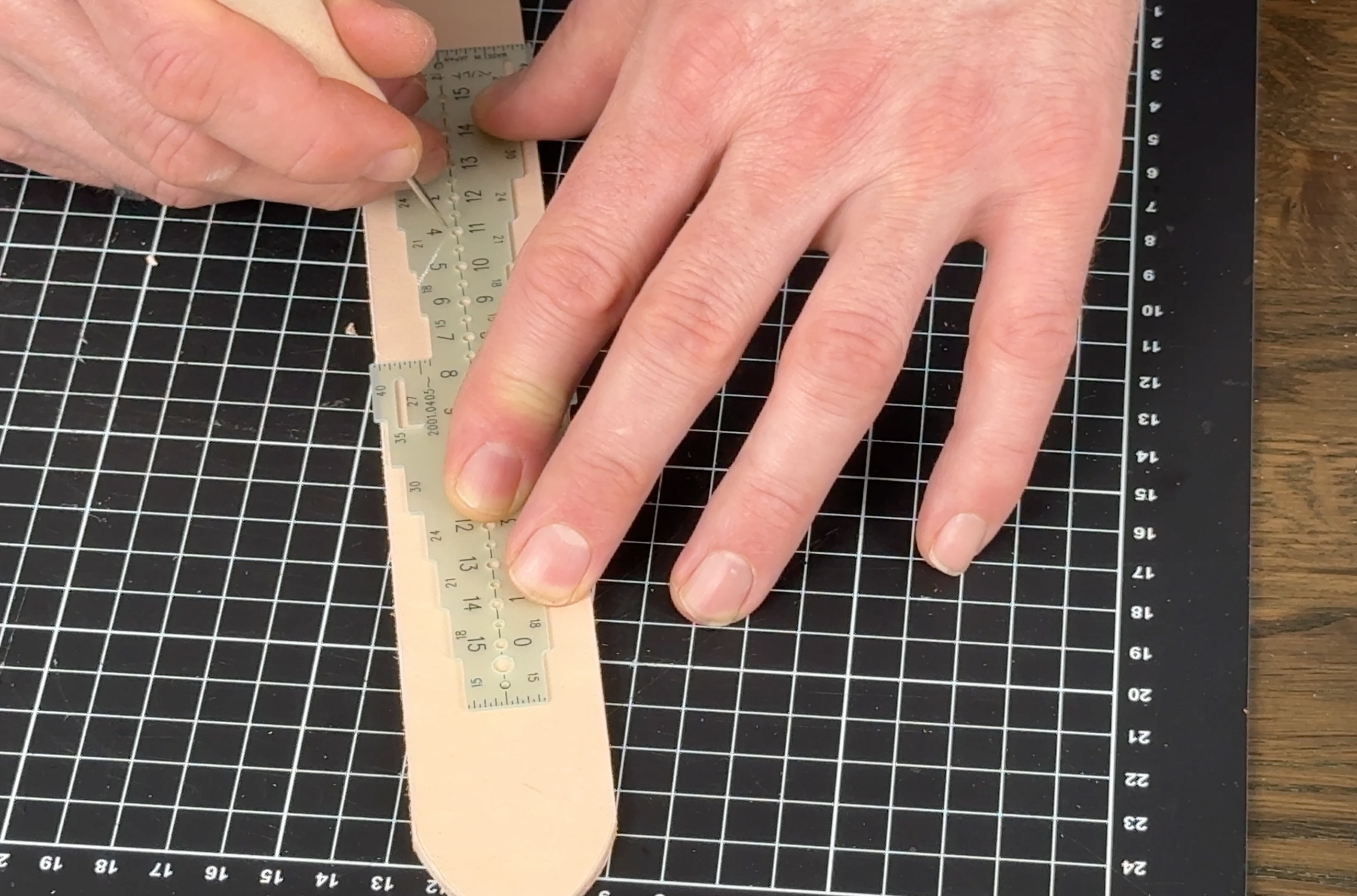 Das Langloch für den Dorn der Schließe entsteht indem zwei benachbarte Löcher mit dem Schlitzeisen verbunden werden.