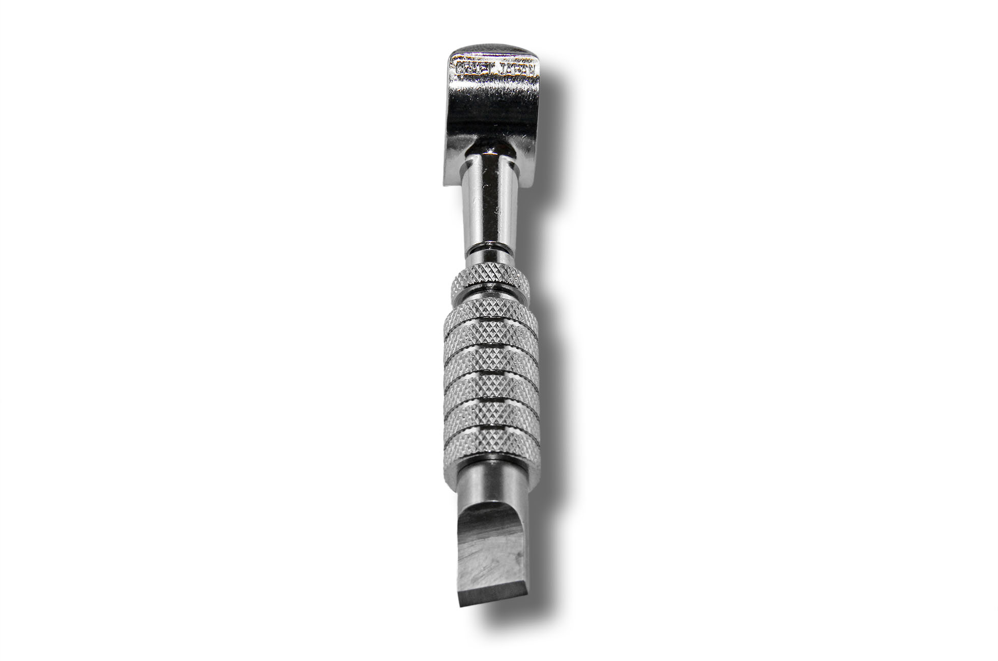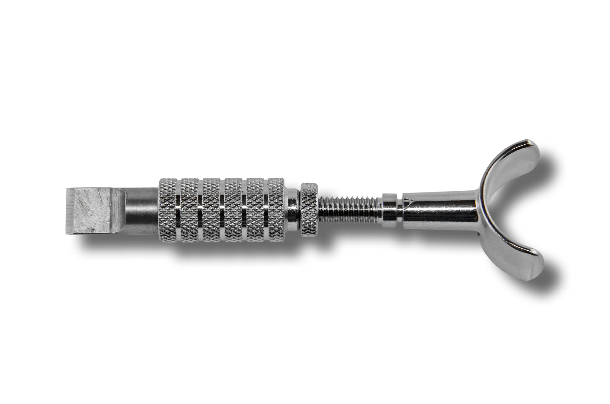 Kurvenmesser mit höhenverstellbarer Fingerauflage zum Vorschneiden des Leders vor dem Punzieren oder zum Schneiden von Mustern und Bildern in das Leder. Auswechselbare Klinge.