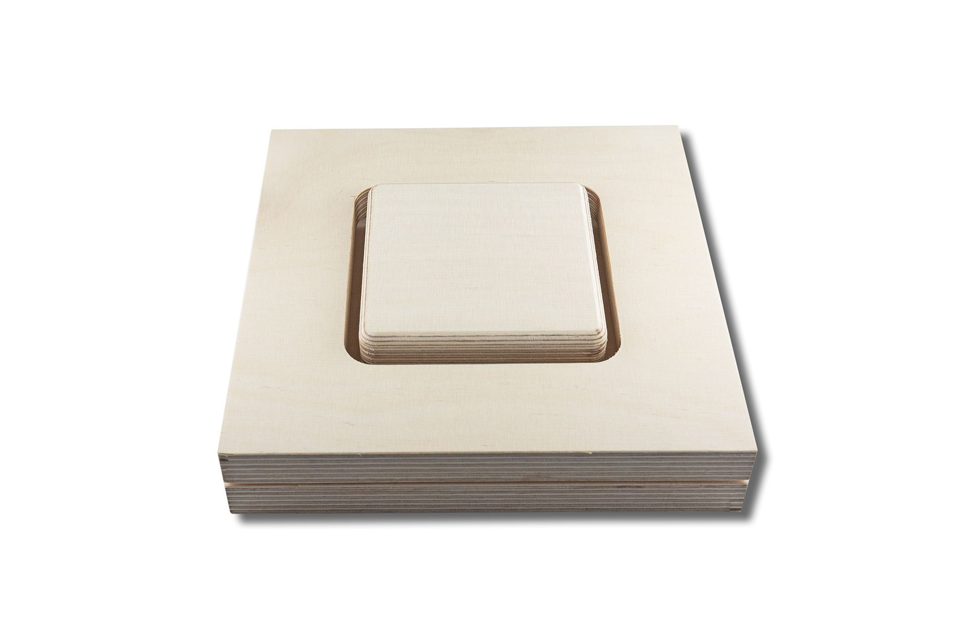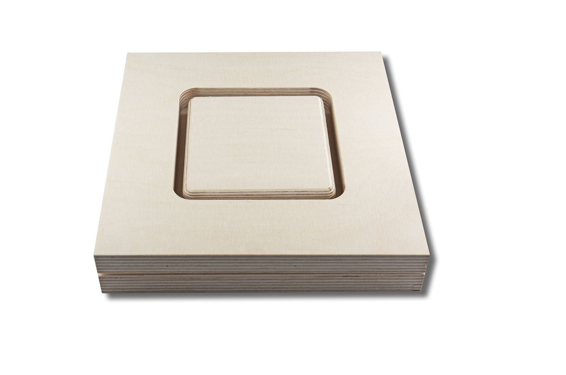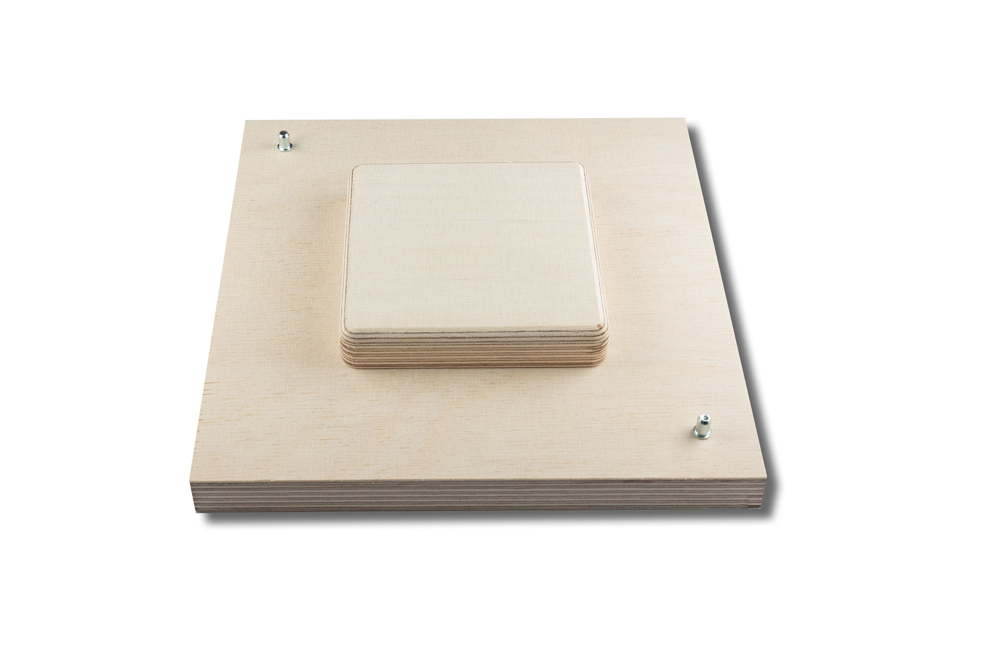 Material: 18 mm Birkensperrholz für Grundplatte, Rahmen und Formteil, durch ein beiligendes Sandwichelement kann das Formteil um 10 mm erhöht werden, die Positionssicherung erfolgt durch Stifte.
