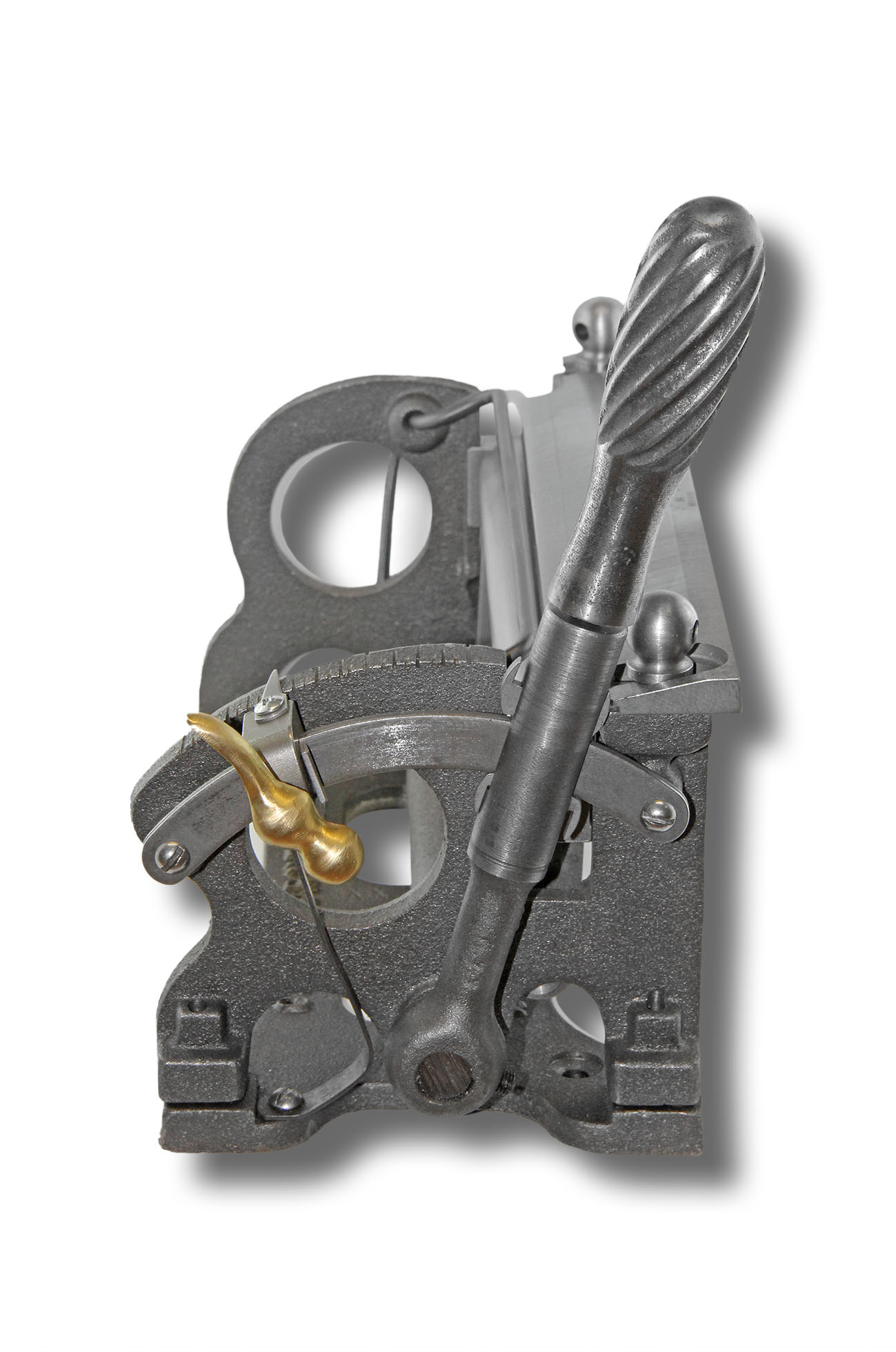 Damit die Maschine fest steht, empfehlen wir Ihnen, diese mit 4 Schrauben (nicht im Lieferumfang enthalten) auf Ihrer Werkbank zu fixieren. Mit der Messing-Flügelschraube rechts kann die zu spaltende Tiefe eingestellt werden (Anschlag). Mit dem Gusseisernen Griff wird die Rolle angehoben, bis die zu spaltende Tiefe erreicht ist. Der Hebel links öffnet und schließt die Führungsschiene die Zugleich einen Schutz vor dem Hineingreiffen in die Klinge ist.