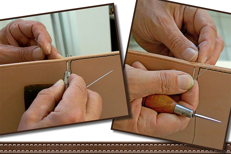 Kursinhalt Nähen: Professionelle Art des Handnähens bei gleichzeitigem Gebrauch von Ahle und Nadeln und Vorbereitung des Fadens. Angefertigt werden mehrere Probestücke mit versenkter Sattlernaht, Hinterstich sowie verschiedenen Ziernähten.