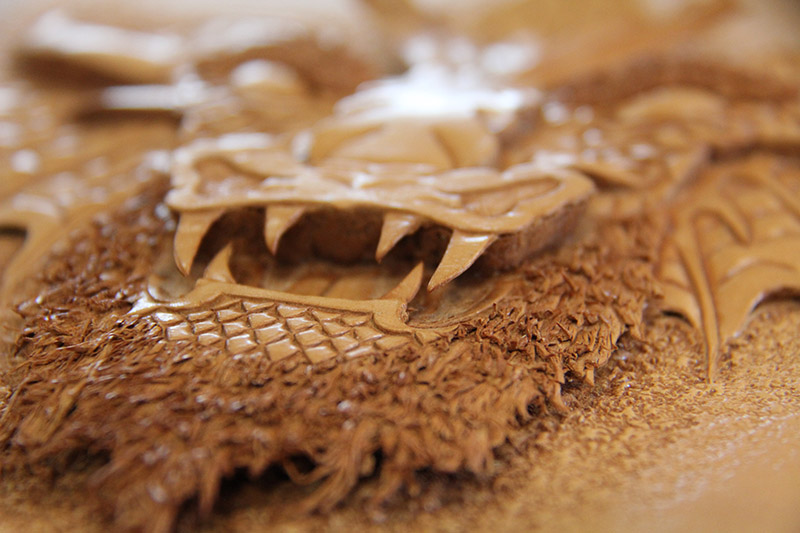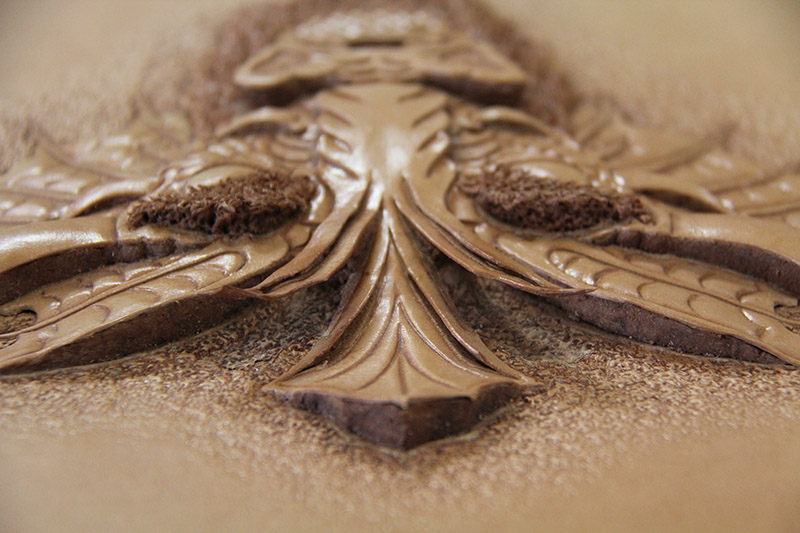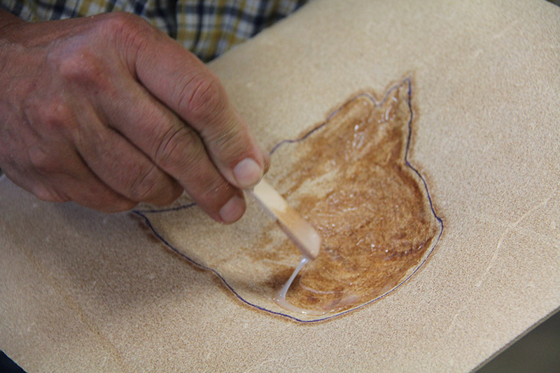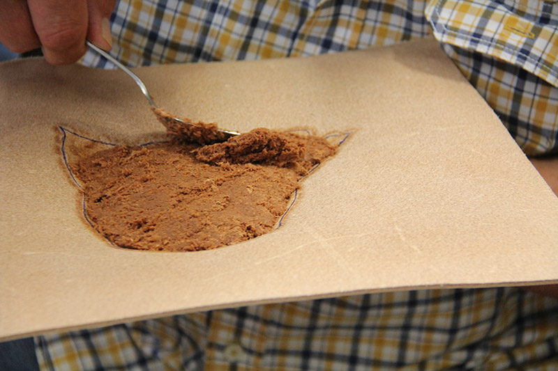 Die Lederflocken werden hierbei mit Klebstoff oder Gummilösung vermischt und als "klebrige" Masse in Position geformt. Die abgelüftete Masse ist noch einige Zeit verformbar um das Werkstück noch genauer anzupassen und auszuarbeiten.