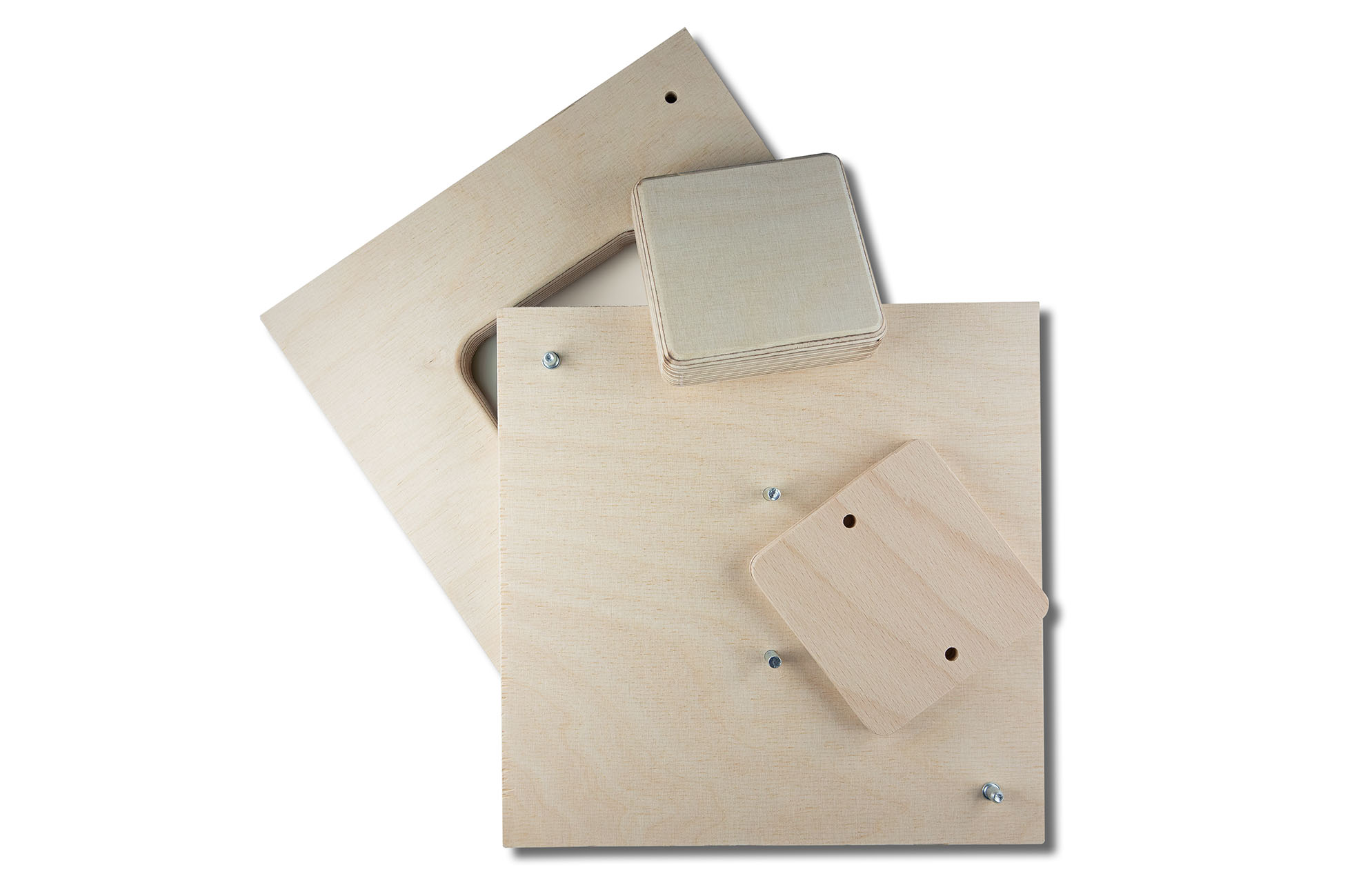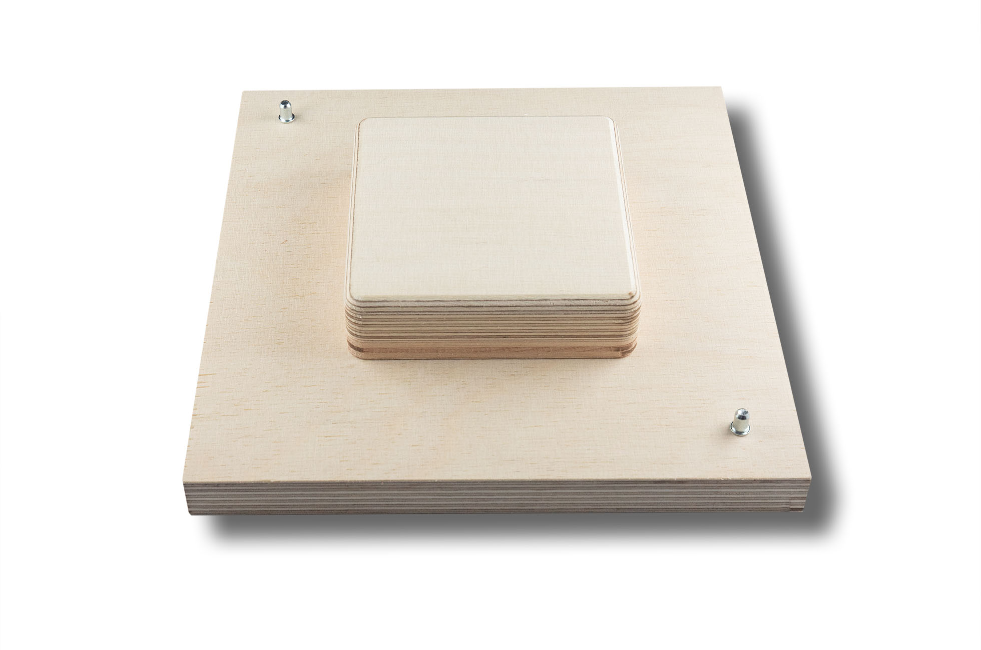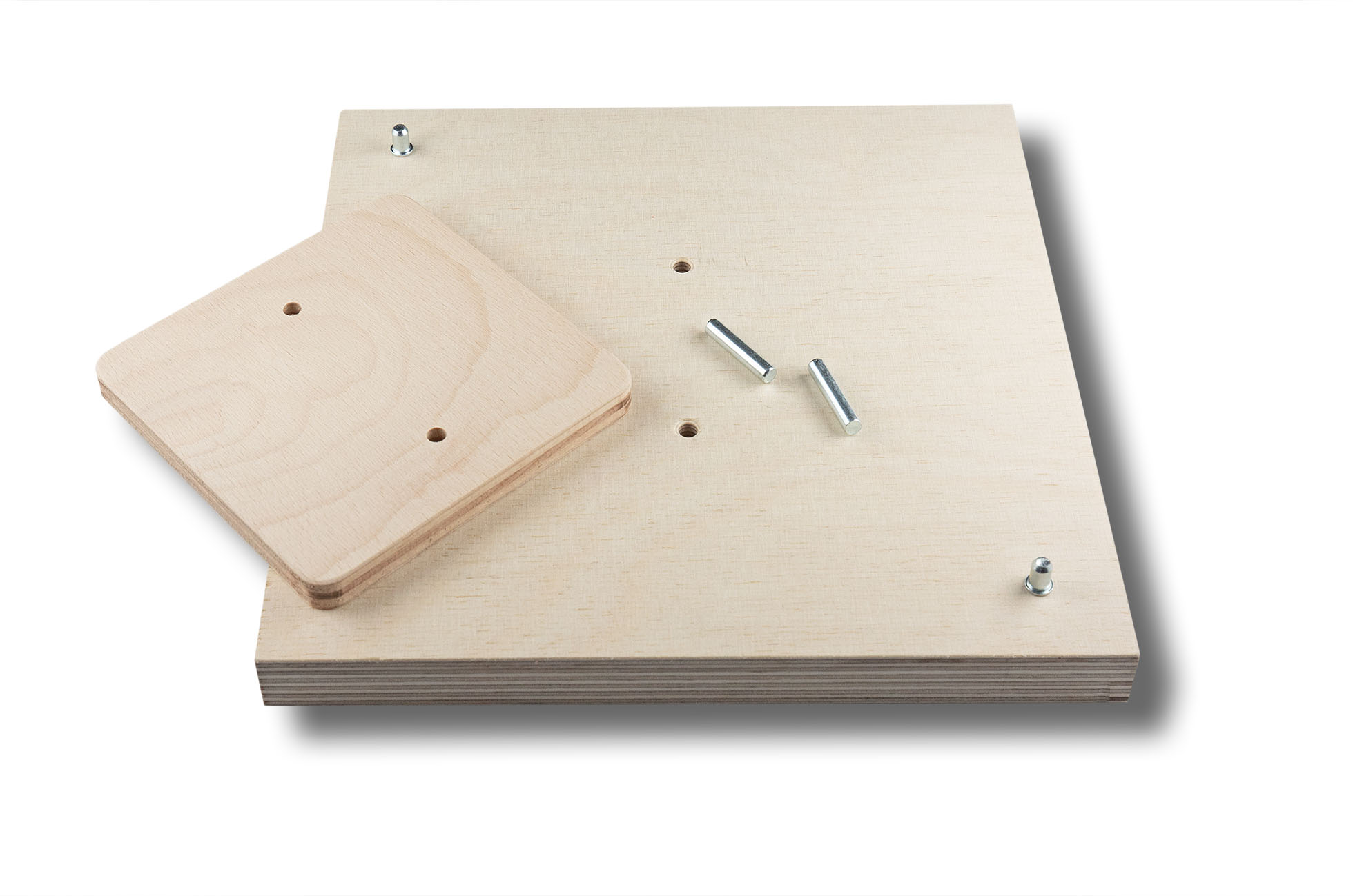 Material: 18 mm Birkensperrholz für Grundplatte, Rahmen und Formteil, durch ein beiligendes Sandwichelement kann das Formteil um 10 mm erhöht werden, die Positionssicherung erfolgt durch Stifte.