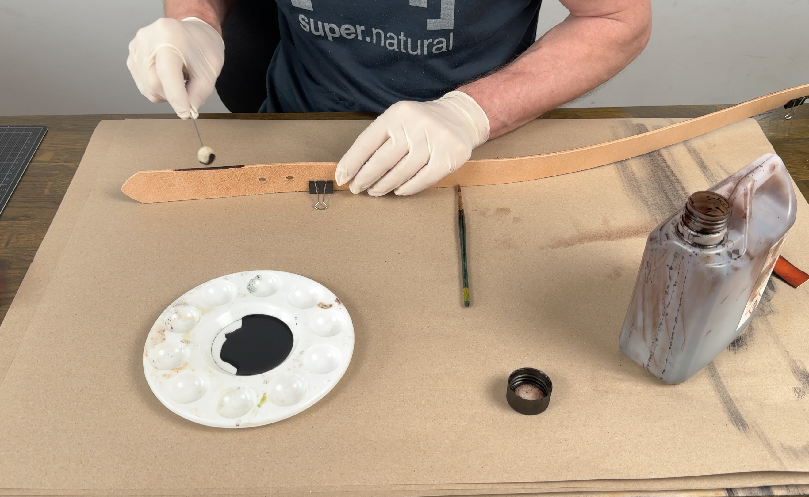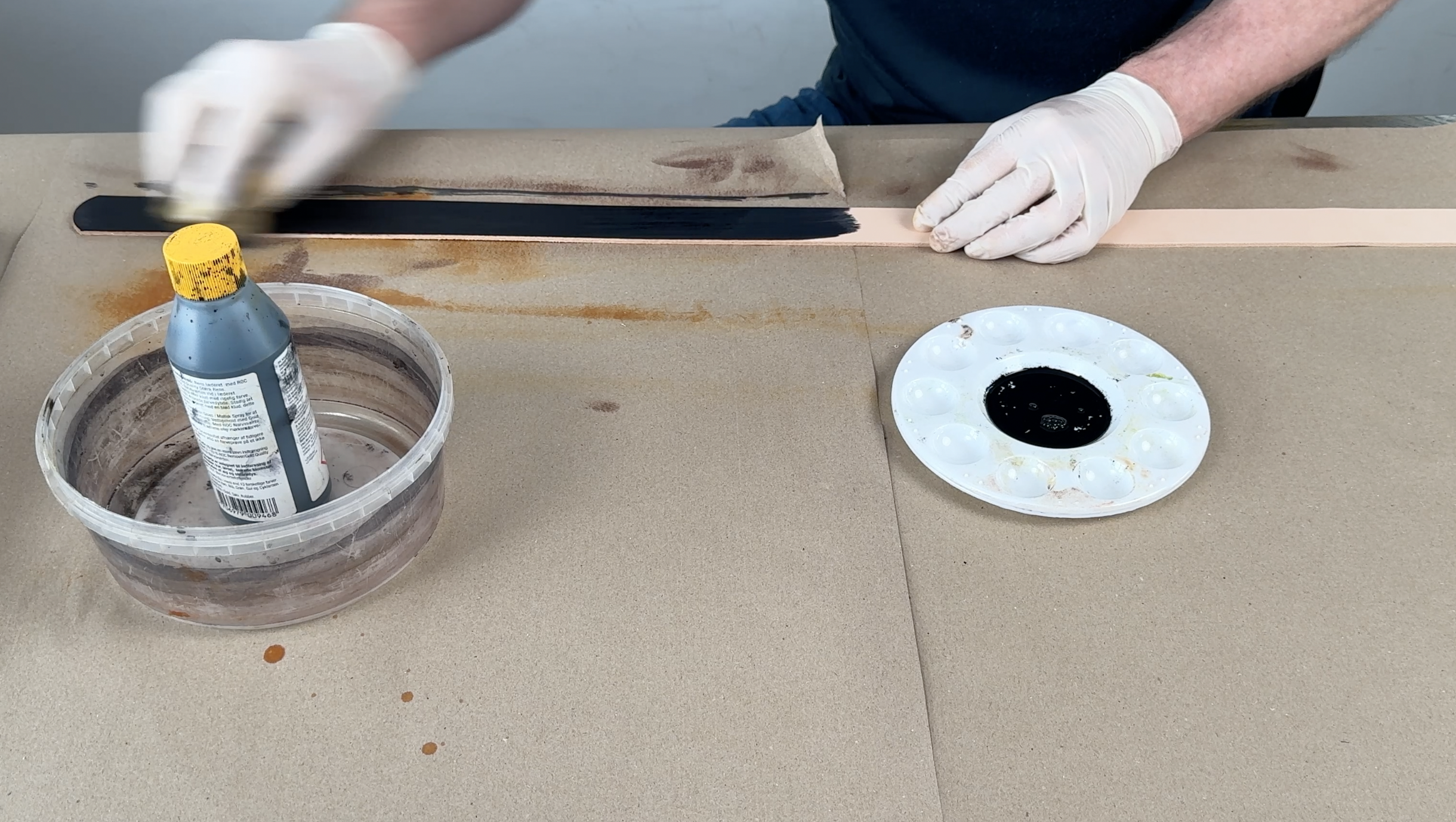 Achtung! Lederfarbe färbt auch Holz, Textil und Haut (Handschuhe verwenden)