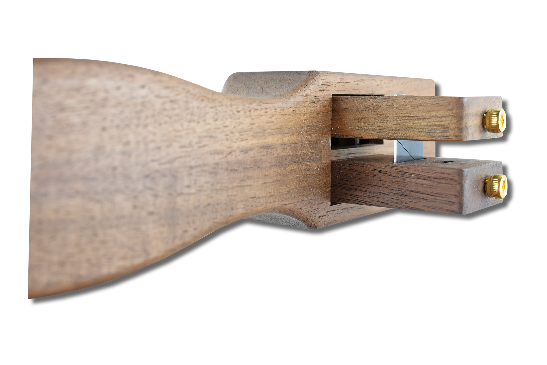 Gefertigt aus massivem Nussbaum und Messingbeschlägen überzeugt dieser Riemenschneider neben der tollen Optik auch durch seine Funktionalität.
